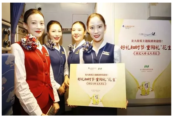 2018年10月17日,即農(nóng)歷九月初九,在SC4698西安—青島的航班上,龍大糧油攜手山東航空打造了一場共賀重陽的“好禮知時(shí)節(jié) 重陽禮‘花生’”主題航班,精心為消費(fèi)者準(zhǔn)備了一份“油”愛的禮物,讓人們帶著愛回家。