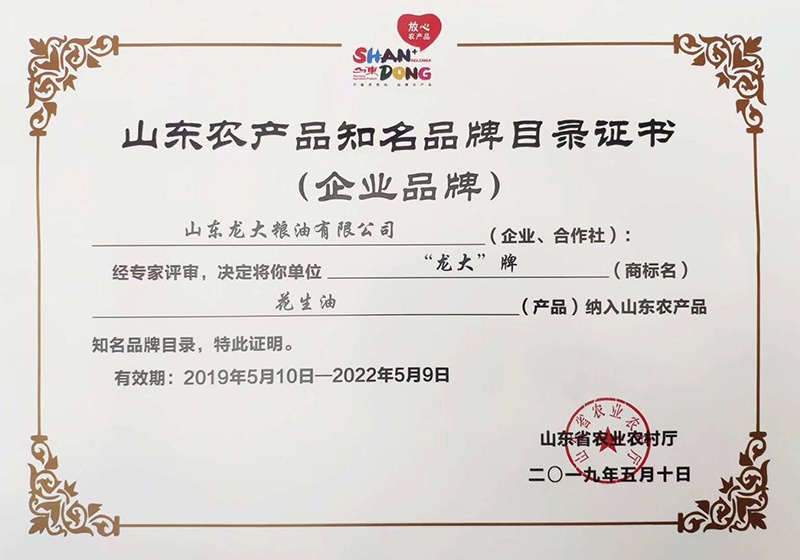 龍大花生油獲評山東省第四批知名企業產品品牌