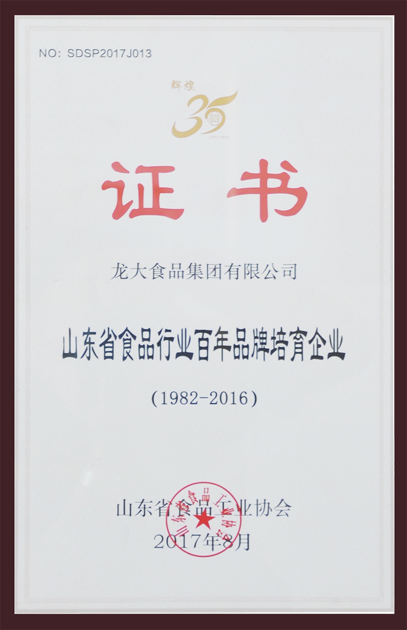 龍大榮獲“山東食品行業(yè)百年品牌培育企業(yè)”稱(chēng)號(hào)